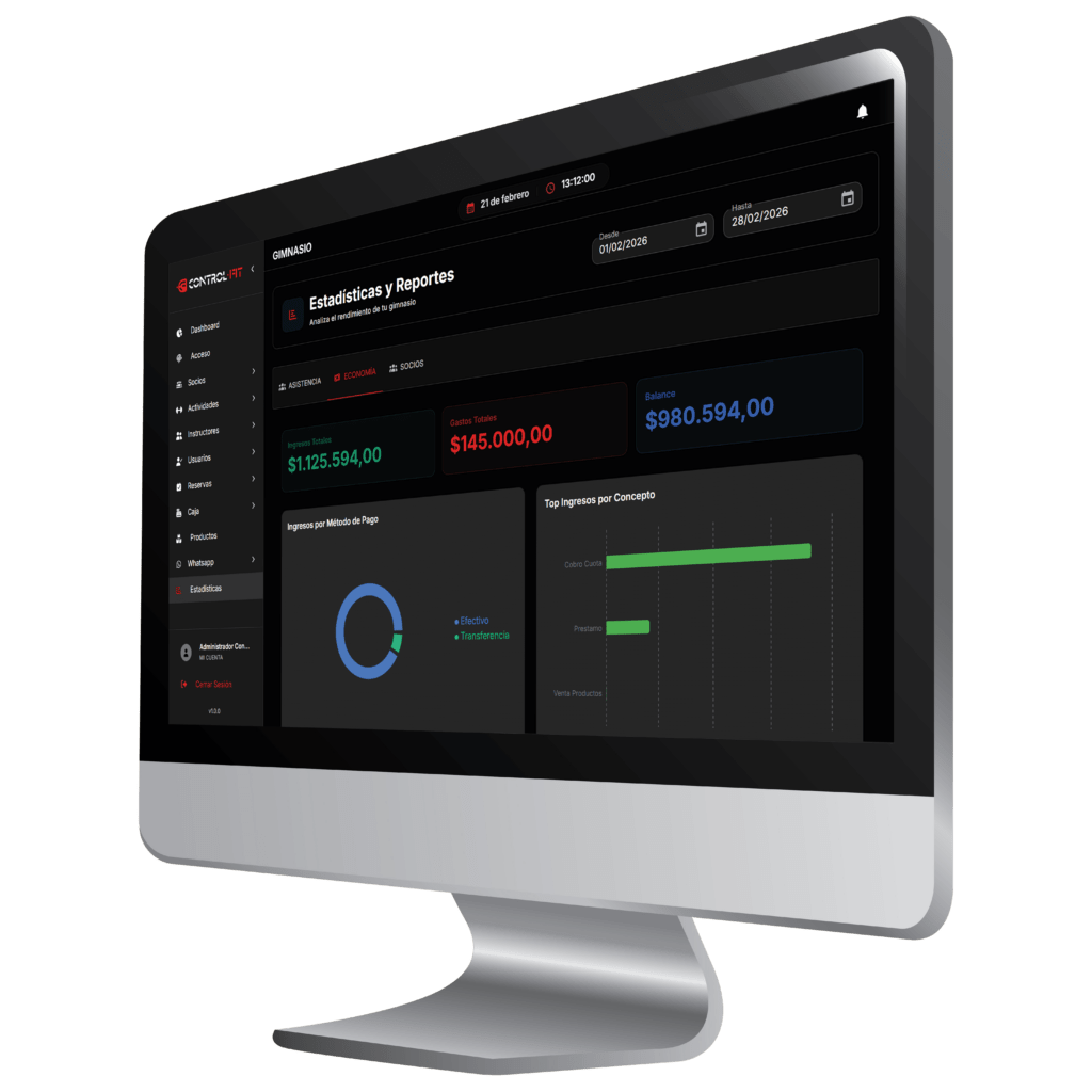 Ideal para dueños y administradores que necesitan controlar el negocio desde fuera del gimnasio.